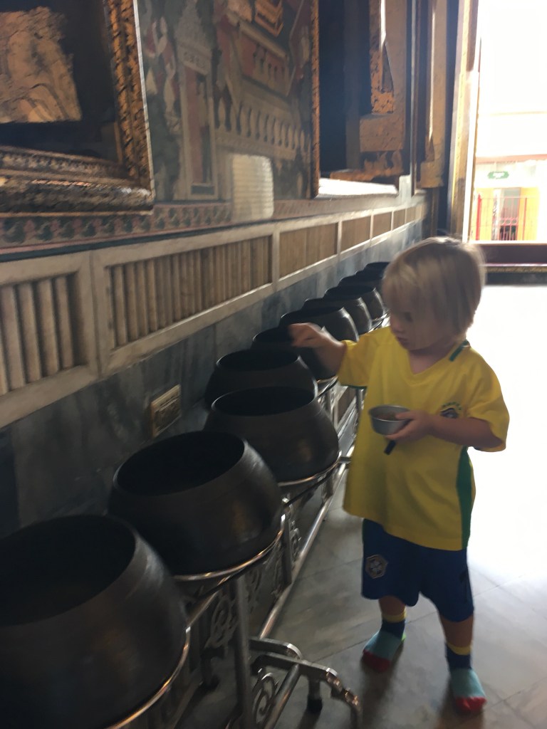 Given that Wat Po is opposite our accommodation it made sense to go there. We arrive as they were opening the doors (my boys are early risers, they did not inherit that trait from me!) and we pretty much had the place to our selves. Lego boy was particularly impressed with the golden reclining Buddha whist Baby blue kept going up to statues and copying their stance. I particularly liked his attempt at putting his leg behind his head.