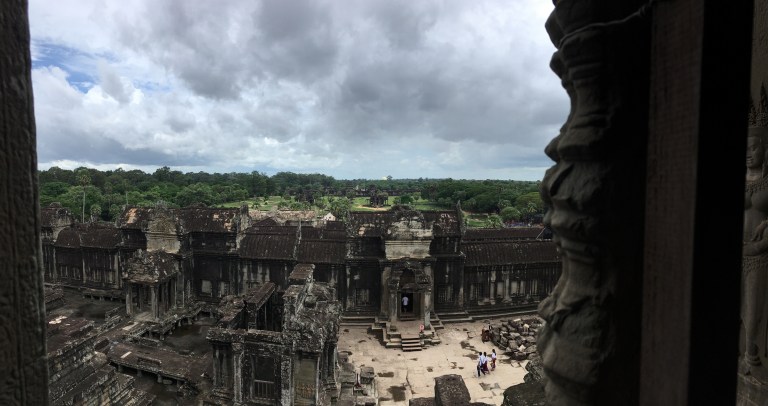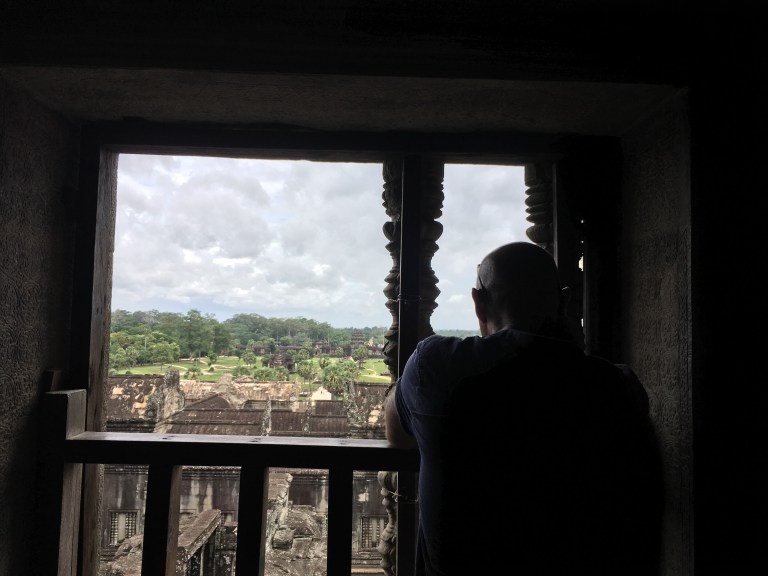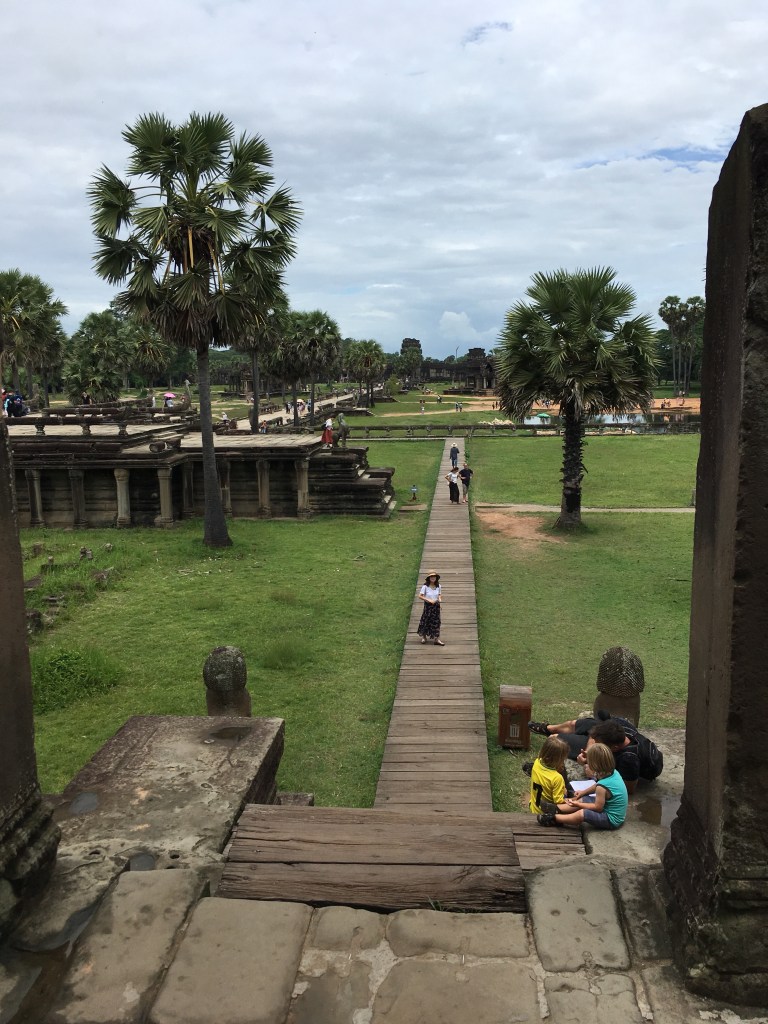 In fact going up wasn’t that bad and the view made it worth it. The space was massive it’s hard to believe it was only built to be used by one person. Each side gave a different view over either the grounds of Angkor Wat or jungle. From the final window we could see our children jumping in puddles below us. Going down wasn’t as nice as coming up but I made it despite having to stop a couple of times and causing a bit of a traffic jam.