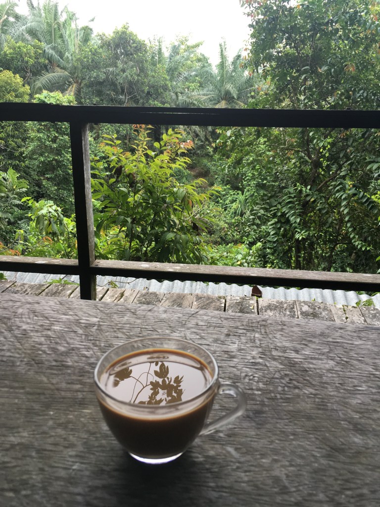 Sandakan airport was small but after our usual first atm withdrawal confusion over currencies we easily managed to get a taxi to our first accommodation. Pagankan dii is certainly rustic verging on basic but the views from the room and the bar are exactly what the doctor ordered! Green, green, green!