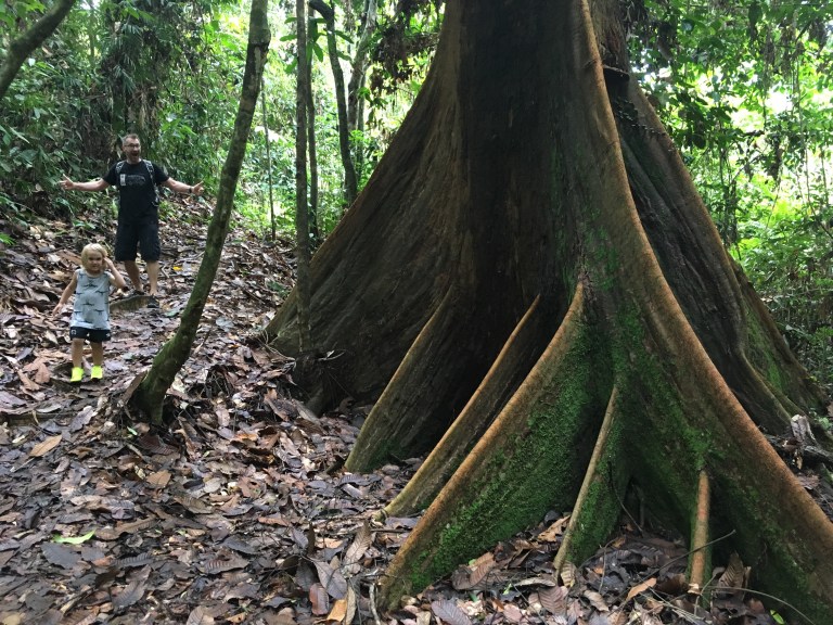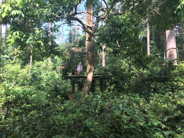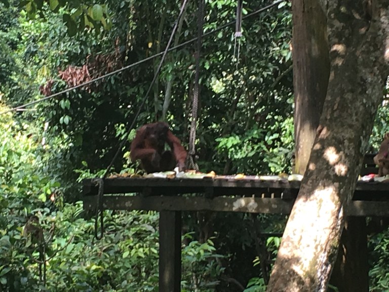 Despite the world of grumpy tourists the boys revelled in being in the jungle, running, climbing, swinging and getting absolutely filfthy. First stop was the organutans, I liked the set up, the humans are contained to walk ways and viewing platforms/buildings, whilst the organutans are free to roam as far as they wish. In fact that is how the rehabilitation centre works… as the organutans learn to become less reliant on their human carers they roam further into the rainforest. My boys particularly enjoyed sitting in the ac’d building near the nursery area watching the young orangutans tumble and restle… my three would have fitted right in! We went to watch the feeding of the older organutans twice, the first time only one appeared, in fact she lead our large group of tourists along the walk way to the feeding platform. According to the guide, she was pregnant and always came for an easy meal 😄. The second time there was more activity, a whole troop of pig tail marquee, one luguar and two adult organutans and best of all one with a baby. We spent a good hour watching 🙂