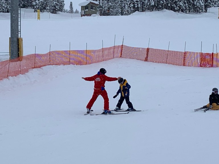 A few more slides down each and thankfully it was time to meet our teacher. Middle man introduced himself as the best skier in the family 😀. He introduced the much more child friendly french fries and pizza terms for the ski positions and pretty soon all the boys could follow Tyler (our teacher) down the small slope. Lego man confidence came on at an incredible rate… and Tyler even managed to tame middle mans enthusiasm for speed by getting him to turn under control.