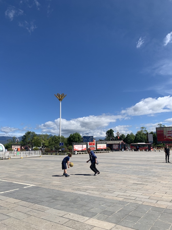 Our drive up to Lijiang took an hour less than we expected so we arrived super early. With no coffee or breakfast options in sight we headed a little way down the hill to find nourishment. a rather simple meal later we walked back up the hill to meet our guide. BBboy was estaicitc to learn that he was a basket ball fan, within minutes they were playing in the square outside the station.