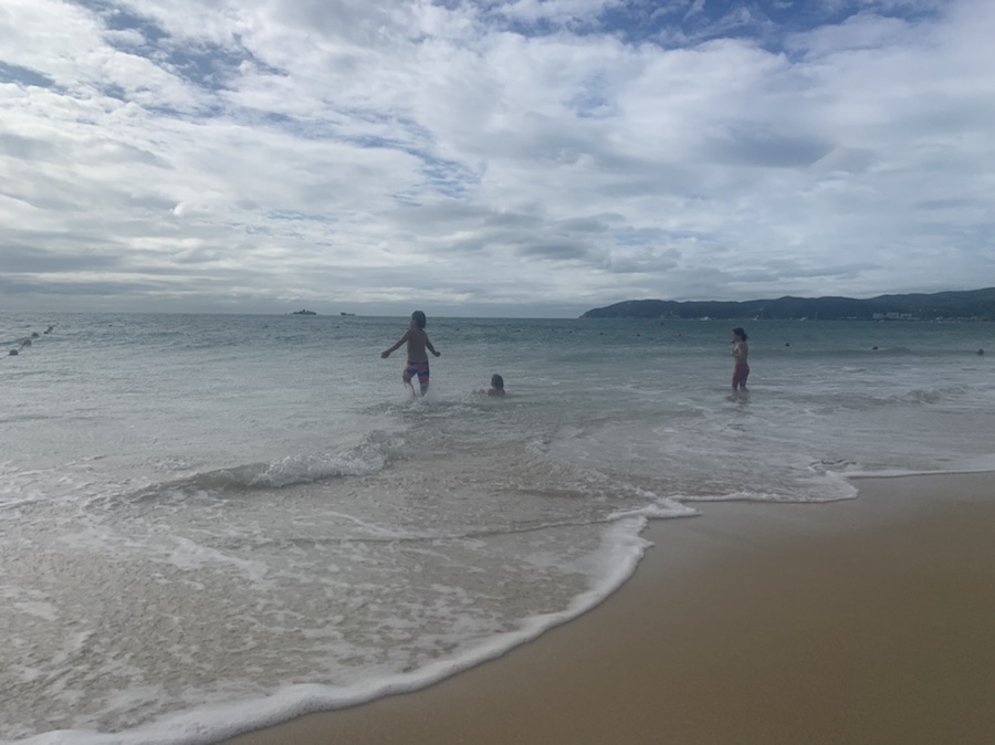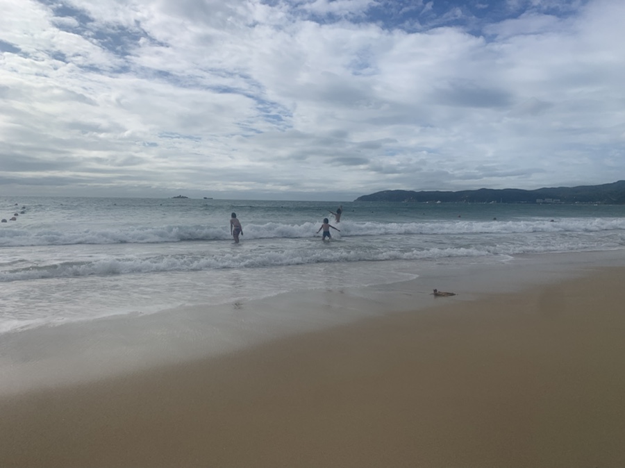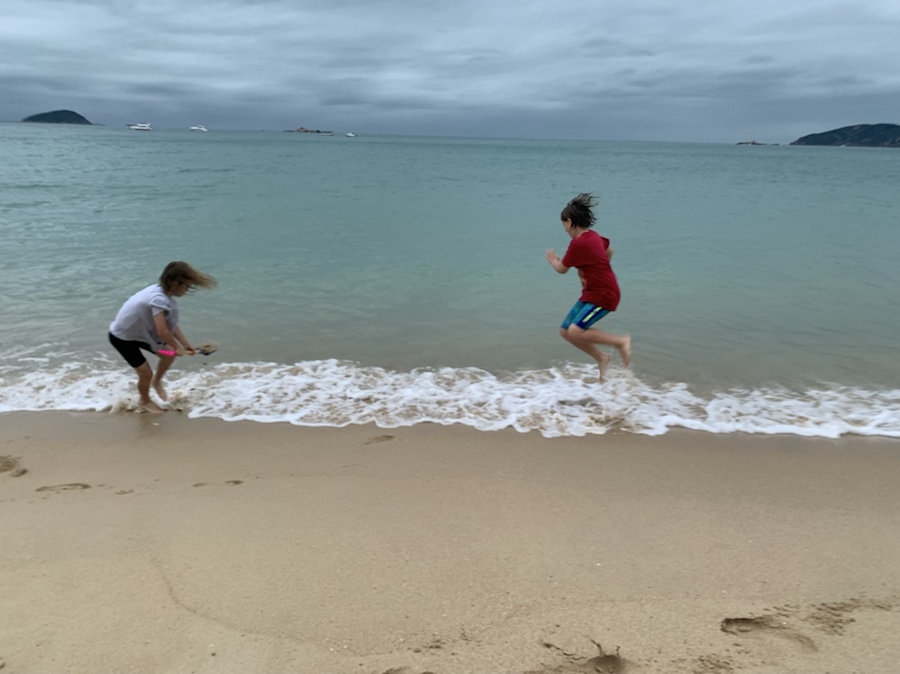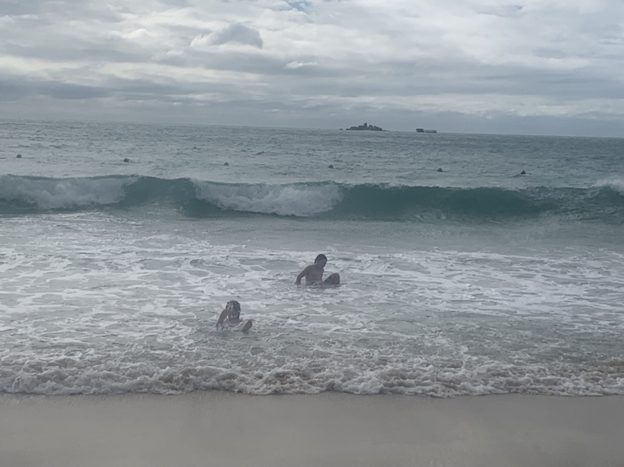 The next morning the boys only had one thing on their mind. Beach! It was less than 5 mins walk. And although over cast and windy the boys were straight in.