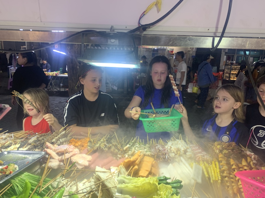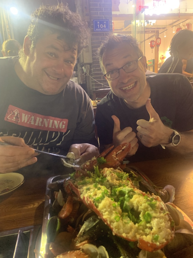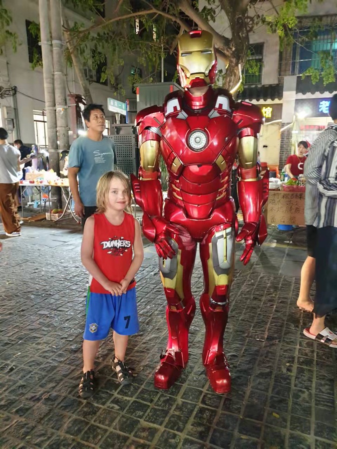 In the evening the street behind the beach became alive with fish restaurants. We ordered a massive platter including lobster, clams, mussels, prawns, crabs and all sorts of other fish on sticks. Whilst we ate the craziness of Chinese street life passed us by. Ez even got a photo with iron man!?