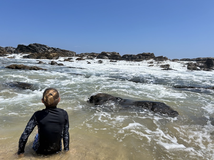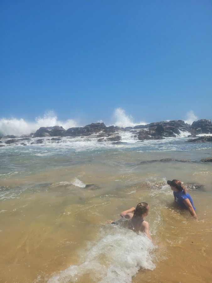 Although the waves were massive there are substantial rocks blocking the way meaning the boys could play in rock pools that were constantly refreshed by explosions of wave tumbling and bubbling over the rocks.