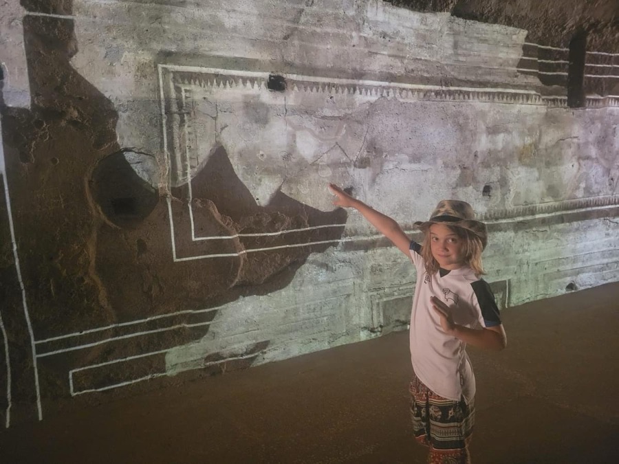Despite the heat we explored for another couple of hours. The boys highlights were the fountains and underground tunnel areas. I loved the mosaic flooring and painted walls still visible in places.