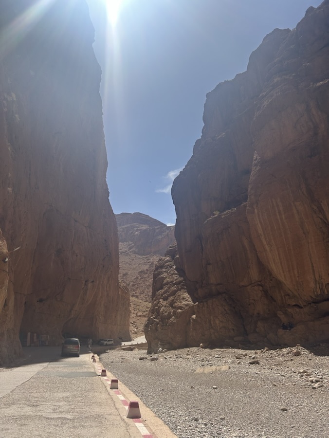 As we left Midelt early morning and the sun rose, the landscape was again became dry and barren but still beautiful. The high plateaus  are home to the nomad Berber people who tents could be occasionally be spotted from the road. The road carved through impressive sandstone canyons and past towering mountains.